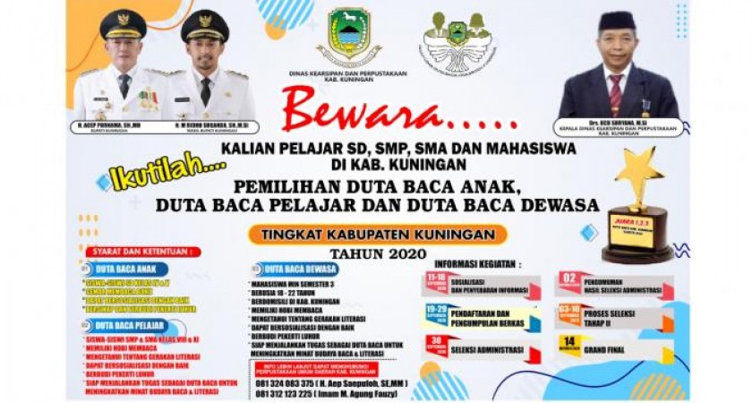 Pemilihan Duta Baca Anak dan Pelajar Tingkat Kabupaten Kuningan adalah sebuah ajang pencarian anak dan remaja yang mempunyai minat dan bakat dalam literasi untuk disebarkan kepada masyarakat Kabupaten Kuningan.